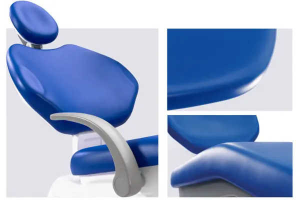 - O encosto de alumínio ultra fino proporciona espaço suficiente para as pernas do dentista e da assistente.