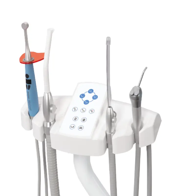O monitor tátil dispõe de 5 programas de memória inteligente e permite controlar a posição da cadeira, ligar ou desligar a luz e encher o copo do seu paciente, à distância de um click.